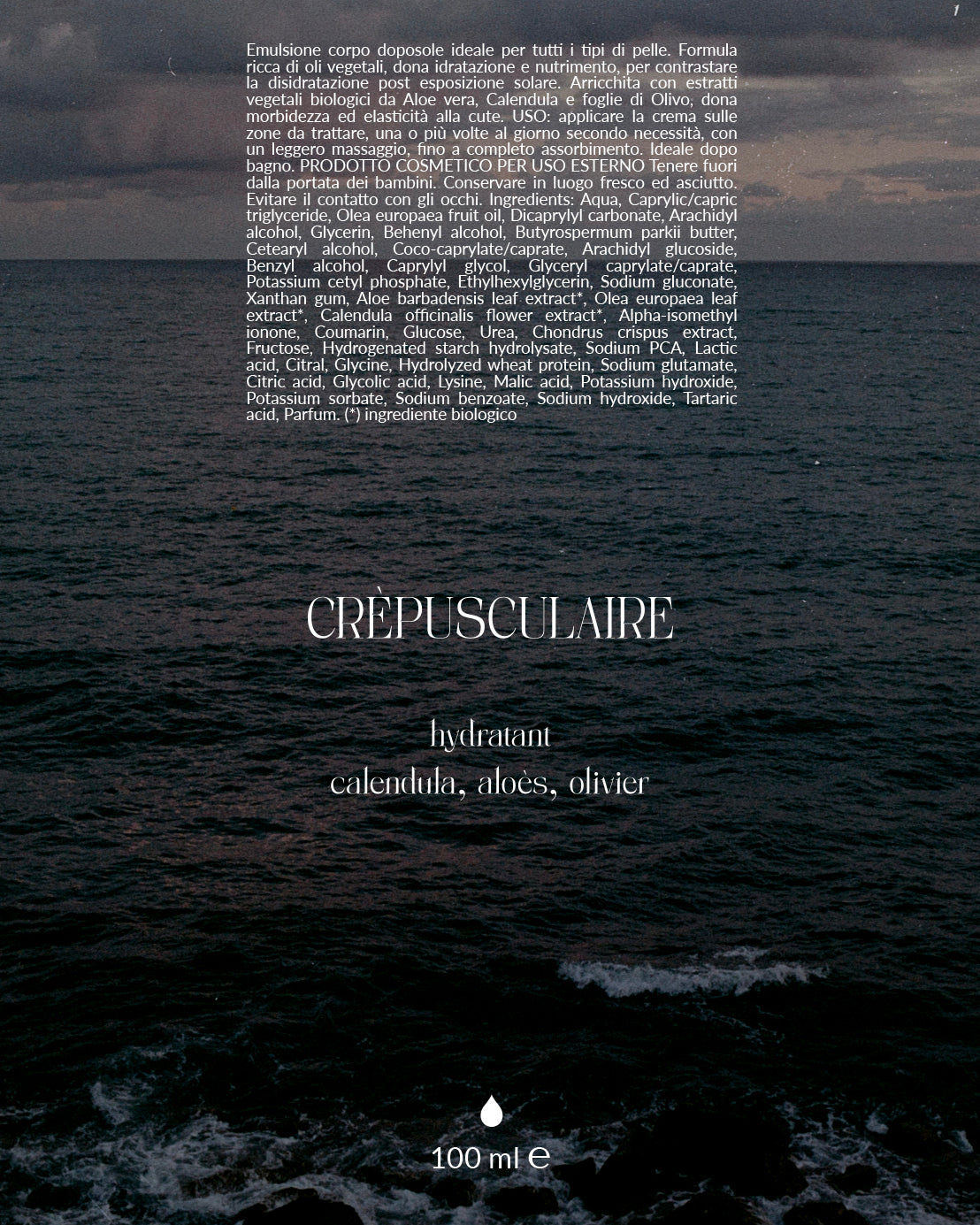 Crèpusculaire - Hydratant, Emulsione corpo doposole ideale per tutti i tipi di pelle. Formula ricca di oli vegetali, dona idratazione e nutrimento, per contrastare la disidratazione post esposizione solare. Arricchita con estratti vegetali biologici da Aloe vera, Calendula e foglie di Olivo, dona morbidezza ed elasticità alla cute. USO: applicare la crema sulle zone da trattare, una o più volte al giorno secondo necessità, con un leggero massaggio, fino a completo assorbimento. Ideale dopo bagno.